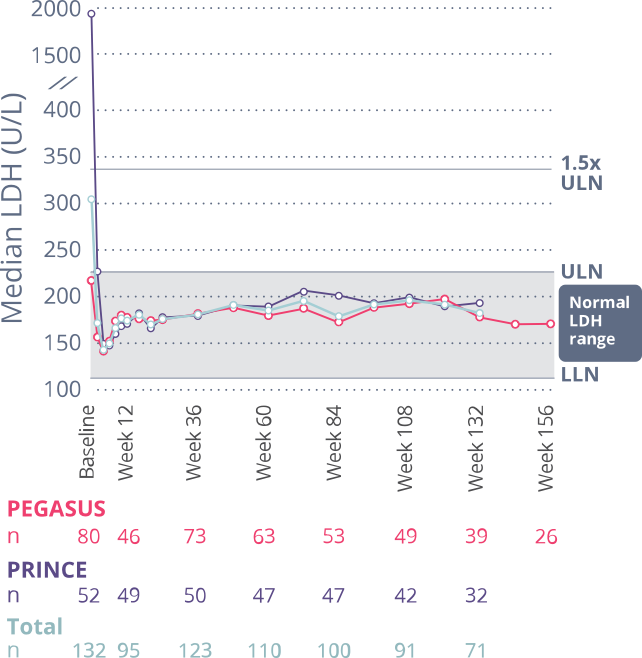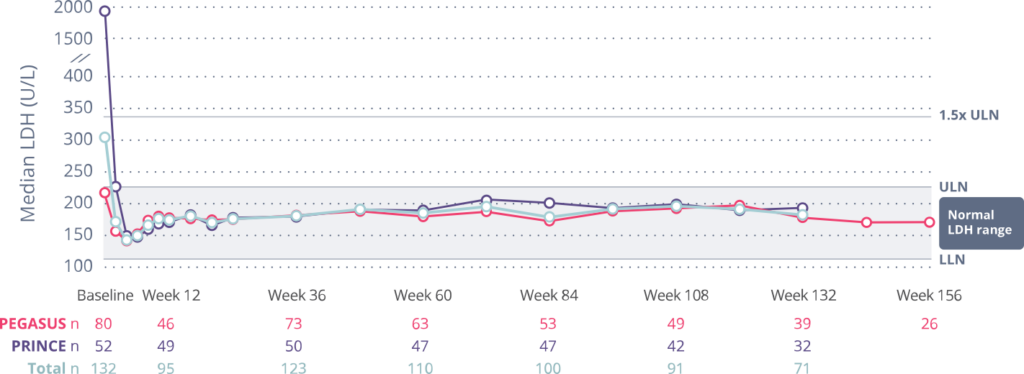 This integrated analysis of data from the EMPAVELI Phase 3 trials (PEGASUS, PRINCE) and subsequent open-label extension evaluated long-term efficacy and safety. Overall, 114 of the 133 patients in the Phase 3 trials enrolled in the extension study (PEGASUS [n=64], PRINCE [n=50]).